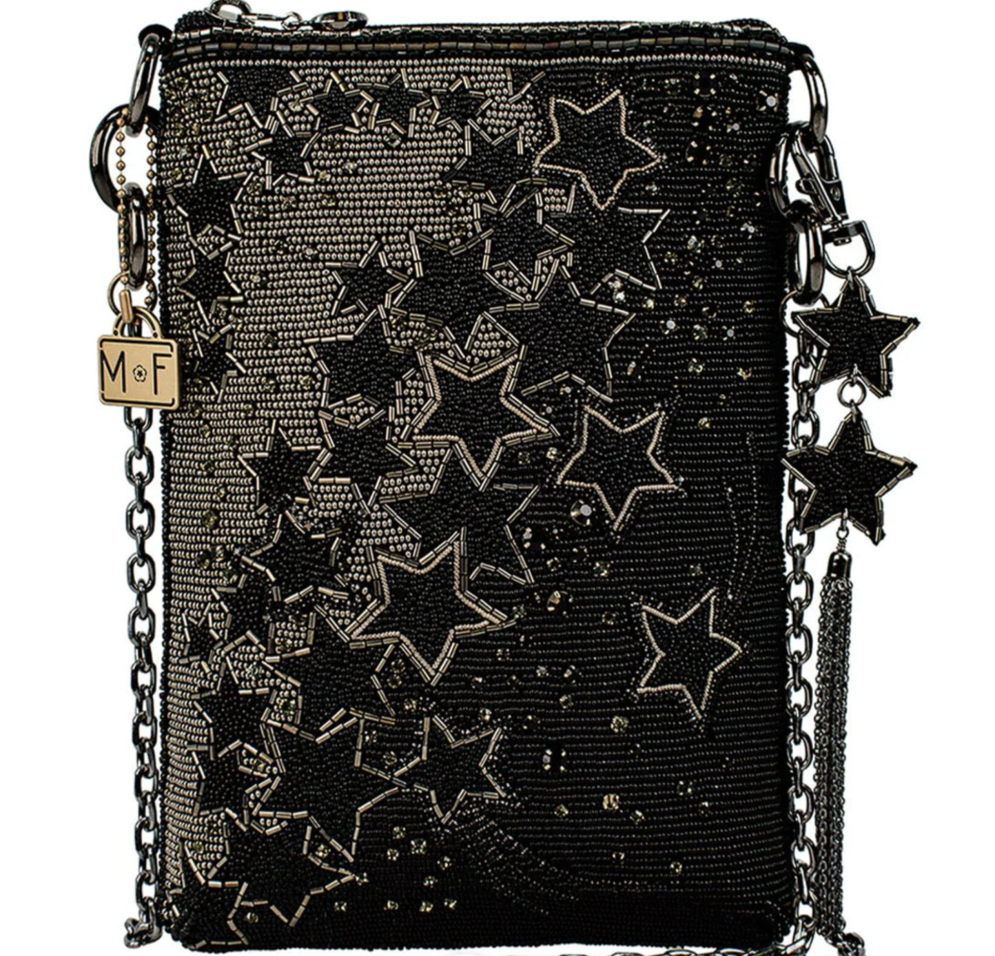 Reach for the stars with this dazzling handbag, feating a cascade of metallic beaded stars that sparkle with every step.