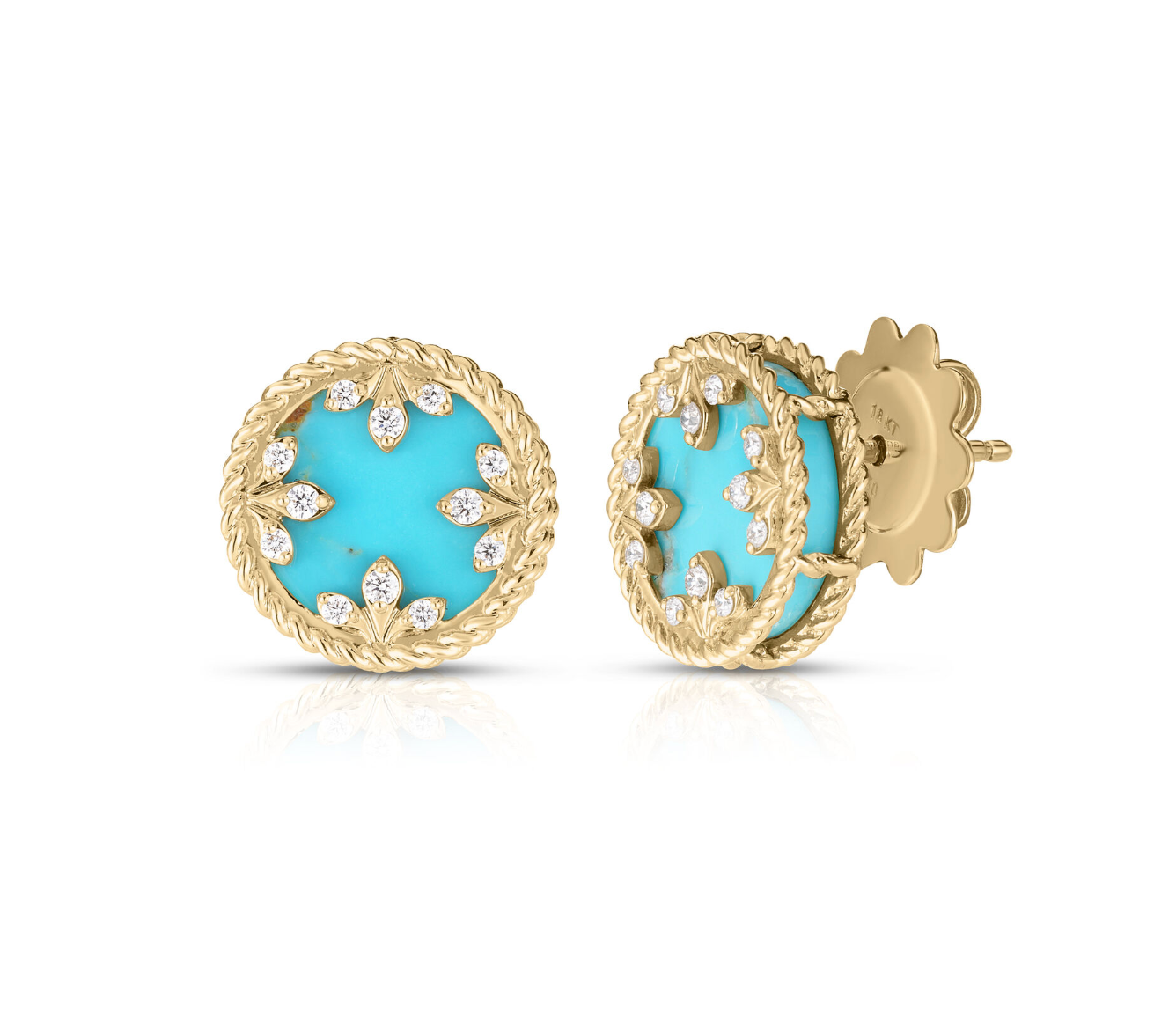 From the Venetian Medallions collection, these 18K yellow gold stud earrings feature turquoise and 0.10ctw diamonds. Diameter: 12mm.
