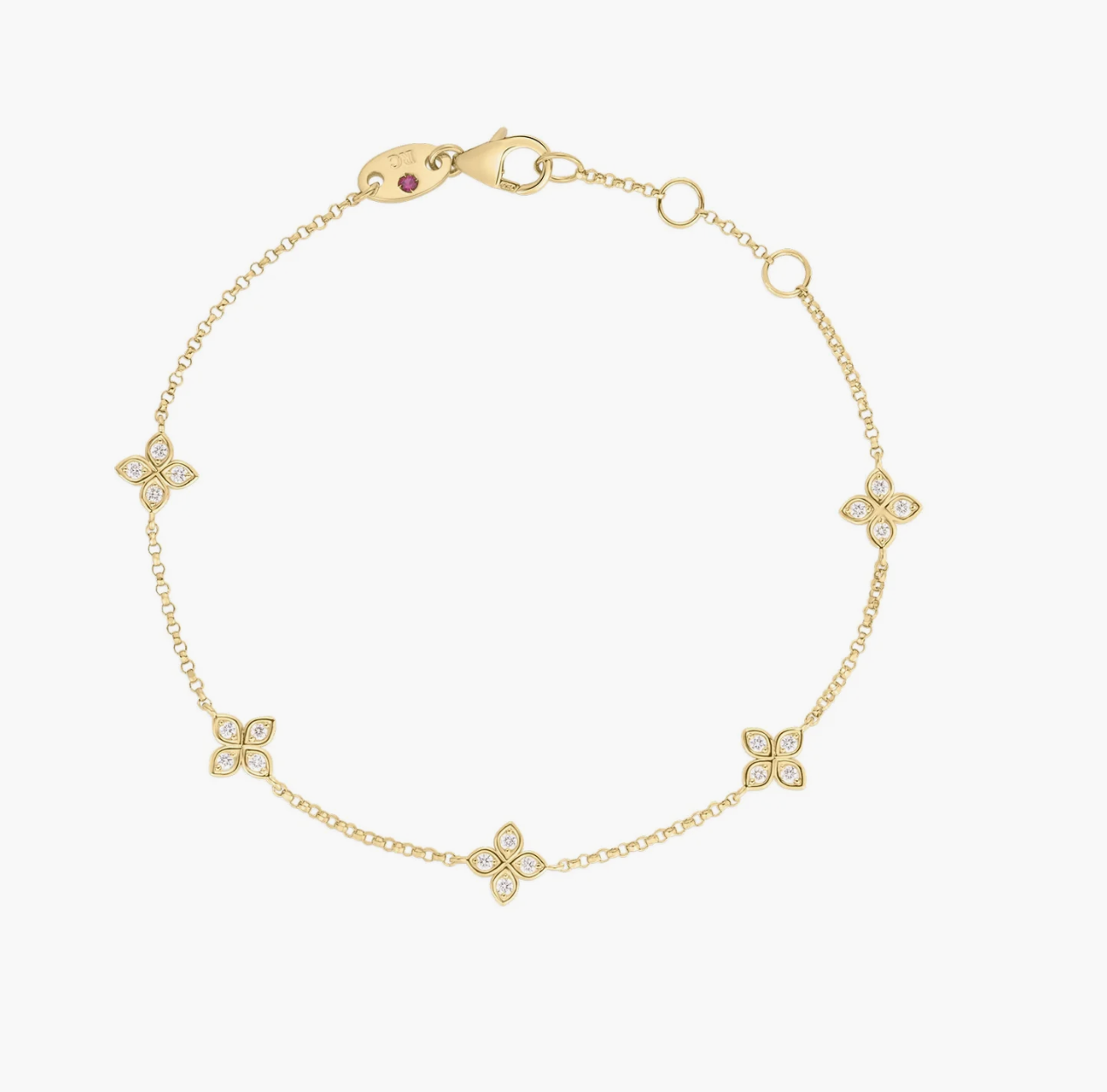 Delicate and charming, this Love in Verona bracelet is crafted in 18K gold and features five evenly spaced flower motifs along a refined chain. Its elegant design combines subtle sparkle with Italian craftsmanship, creating a versatile piece that adds sophistication to any look.