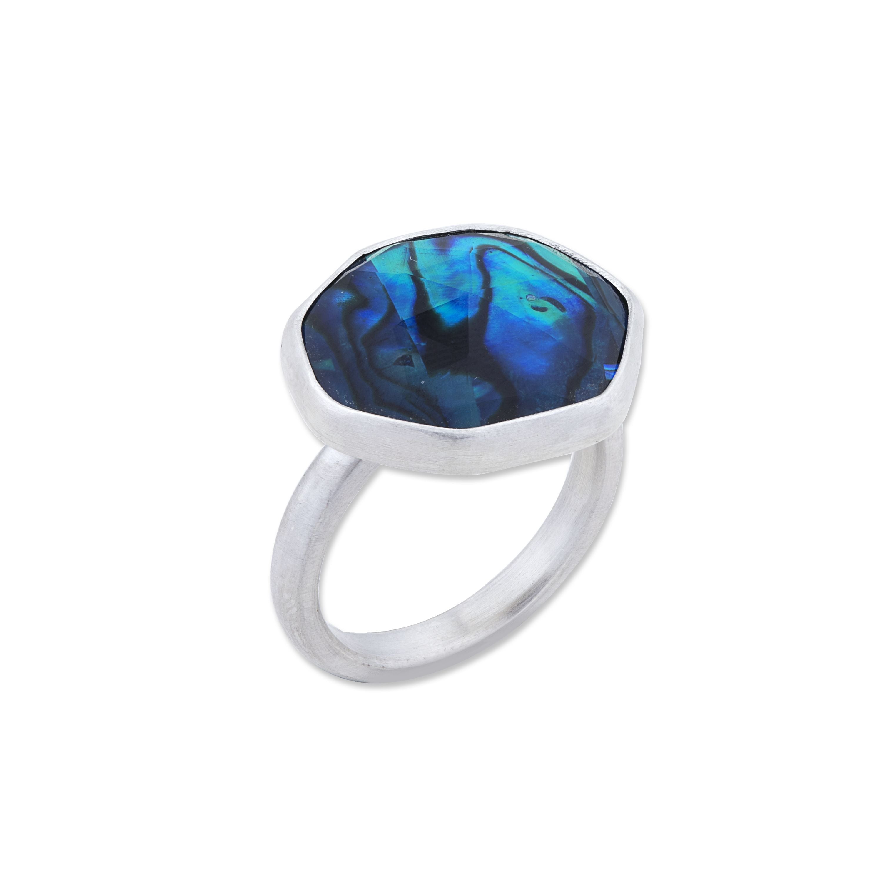 This Lika Behar Ocean ring combines abalone and crystal quartz doublets totalling approx. 9.74 ct in sterling silver with a satin finish shank. A bold statement piece with organic texture and luminous color.