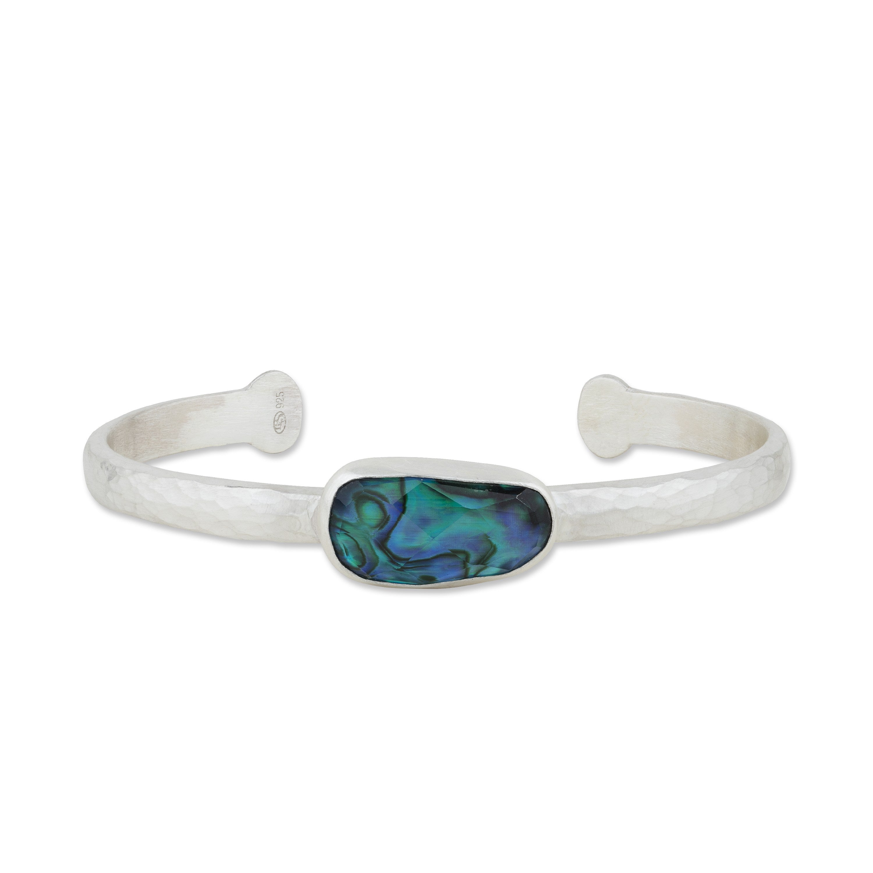 This hammered sterling silver Ocean Cuff showcases luminous abalone and rock crystal doublets totalling approximately 8.88 ct. A sculptural piece evoking calm Mediterranean waters with organic texture and artisan flair.
