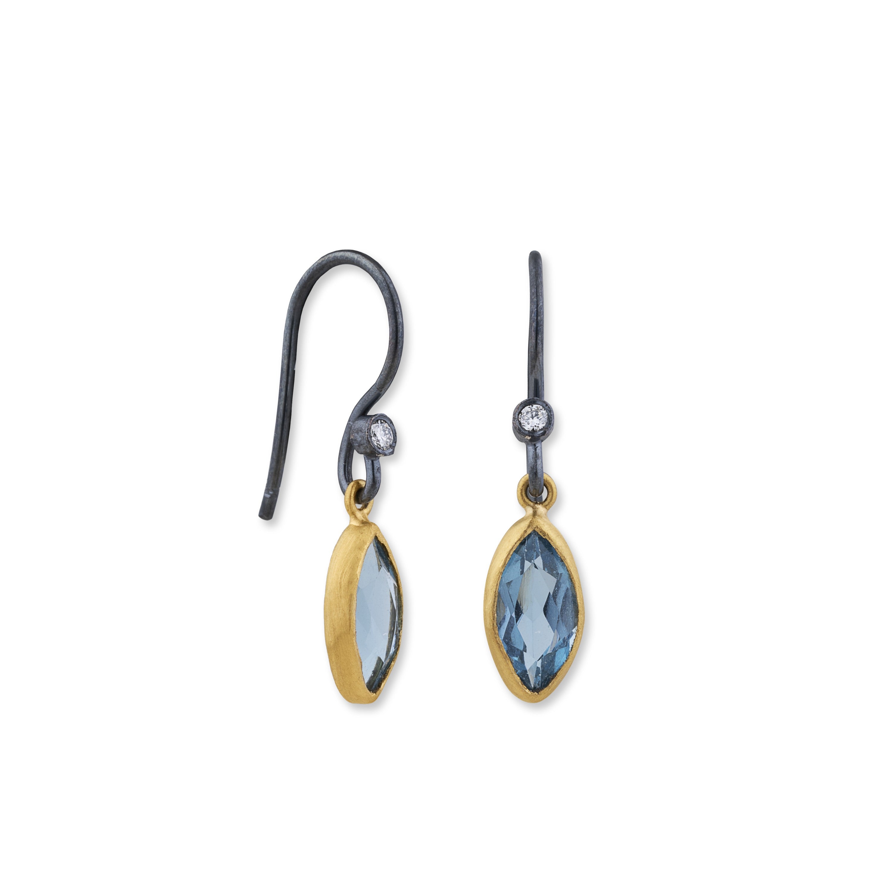 Crafted in 24K gold and oxidized sterling silver, these Thames Earrings showcase London blue topaz gemstones totaling approximately 2.44 ct with subtle diamond accents. Finished with oxidized silver ear wires, they blend rich color with artisan craftsmanship.