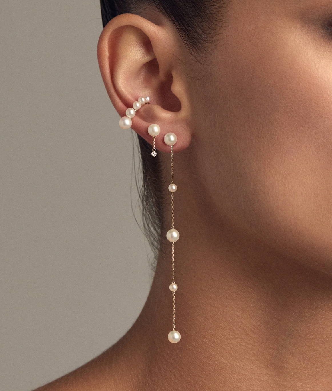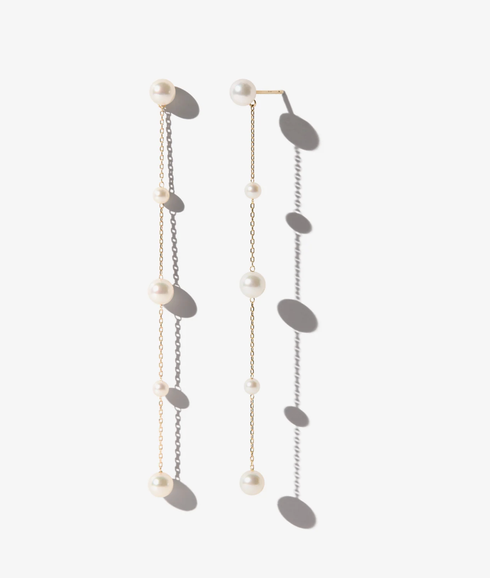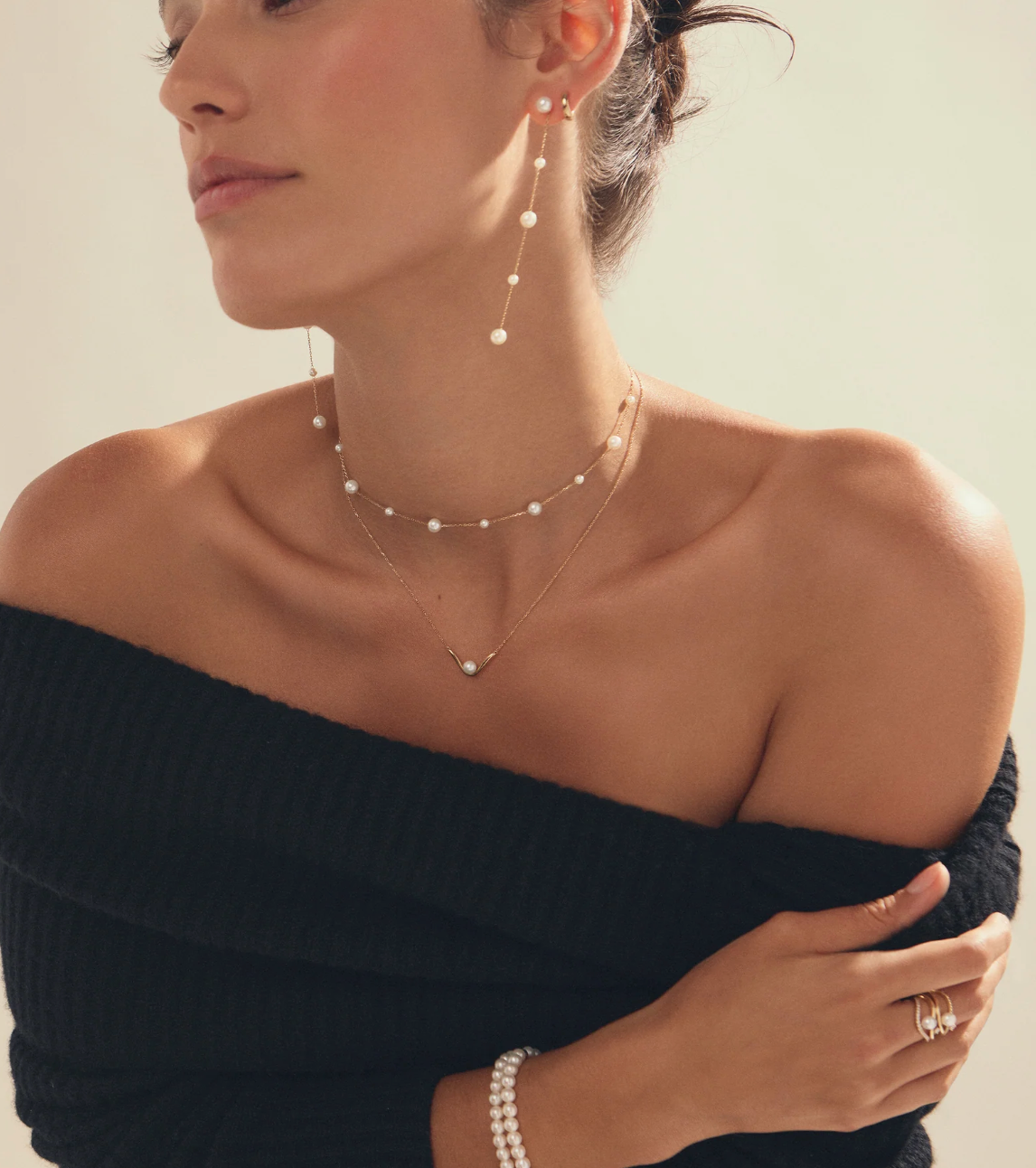 The beautiful simplicity of Mizuki. Pearls float in a repeating pattern on a gold chain in perfect scale and style. Can be layered or worn alone. Timeless.