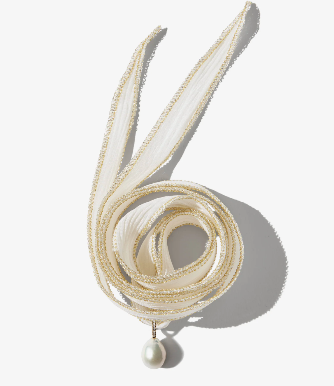 Only Mizuki creates such style and fashion. Casual yet sophisticated white silk with gold trim combines with a small diamond and pearl charm. Can be worn as a necklace or bracelet.