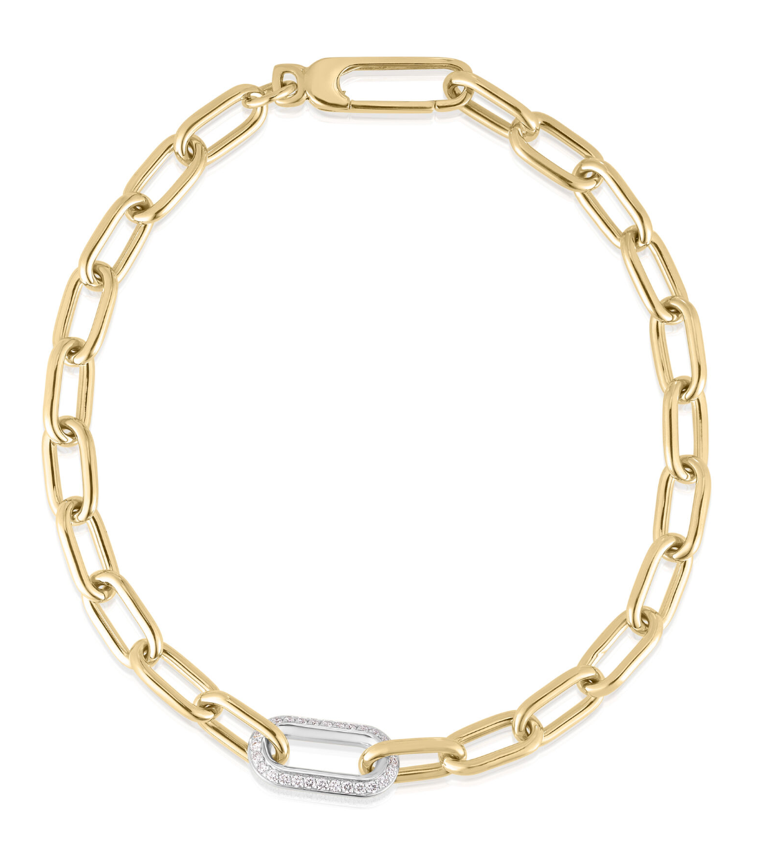 This mixed-metal Designer Gold bracelet combines yellow and white gold oval links with a diamond connector totaling approximately 0.25 ct. A bold yet wearable everyday luxury piece.