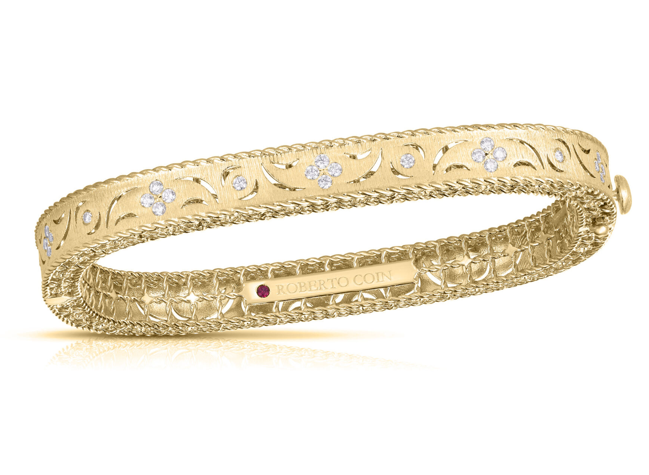 This Diamond Princess bangle in 18K yellow gold features diamonds totaling approximately 0.34 ct set across a 46x56mm hinged design. A sleek, elegant bracelet with regal sparkle.