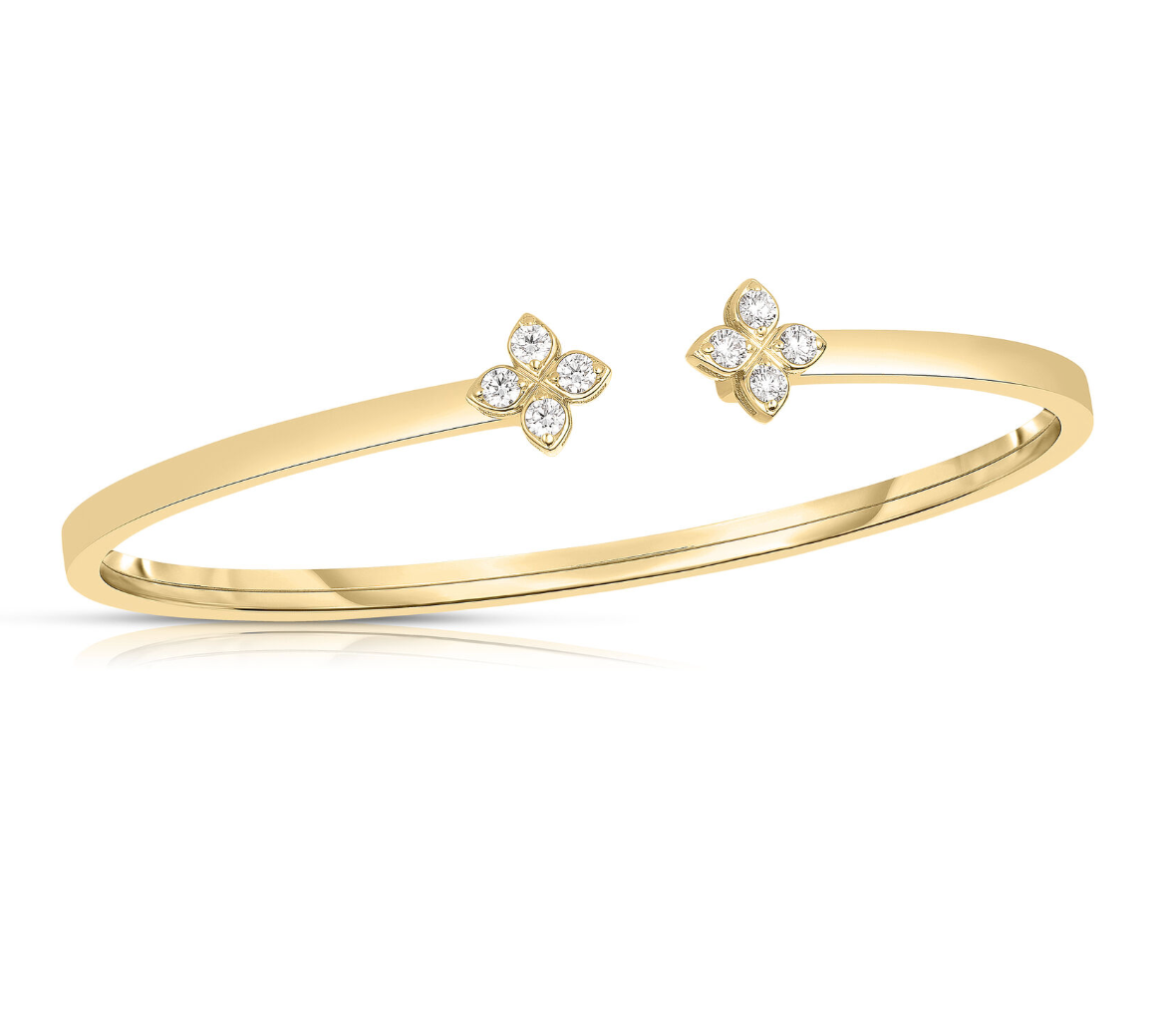 This flexible open-top bangle in 18K yellow gold features floral-inspired diamond accents totaling approximately 0.20 ct. Lightweight and comfortable, it brings easy elegance to everyday looks.