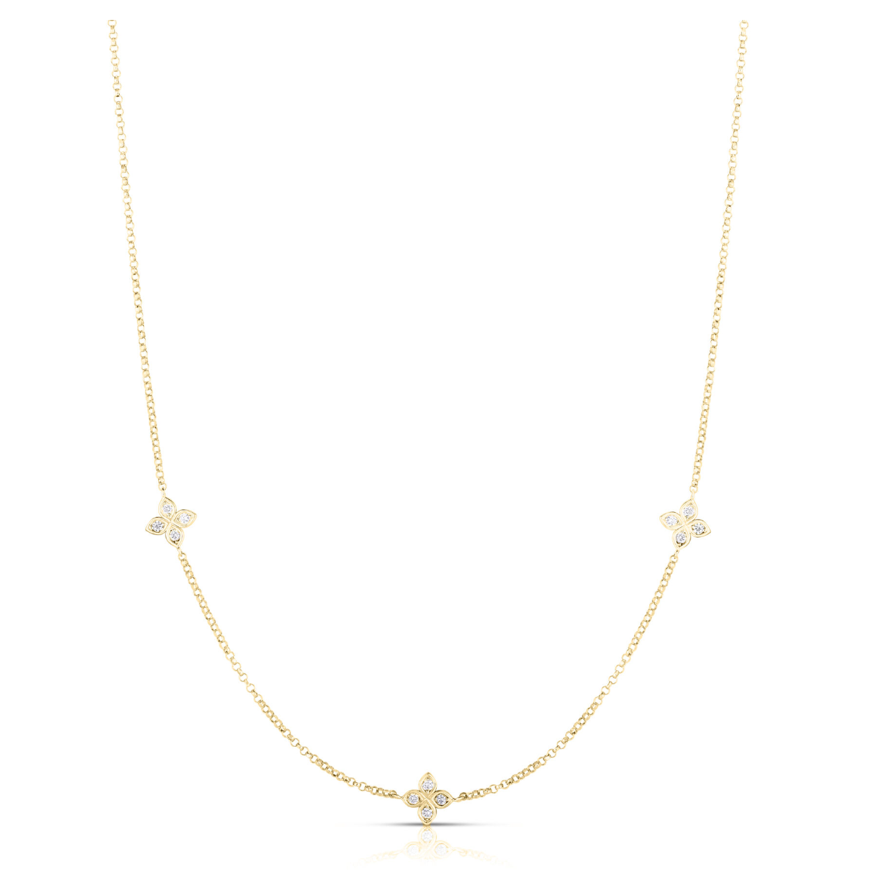 This 18K yellow gold Love by the Inch necklace features three bezel-set diamond stations totaling approximately 0.13 ct along a fine chain. Effortlessly elegant on its own or layered with other necklaces.