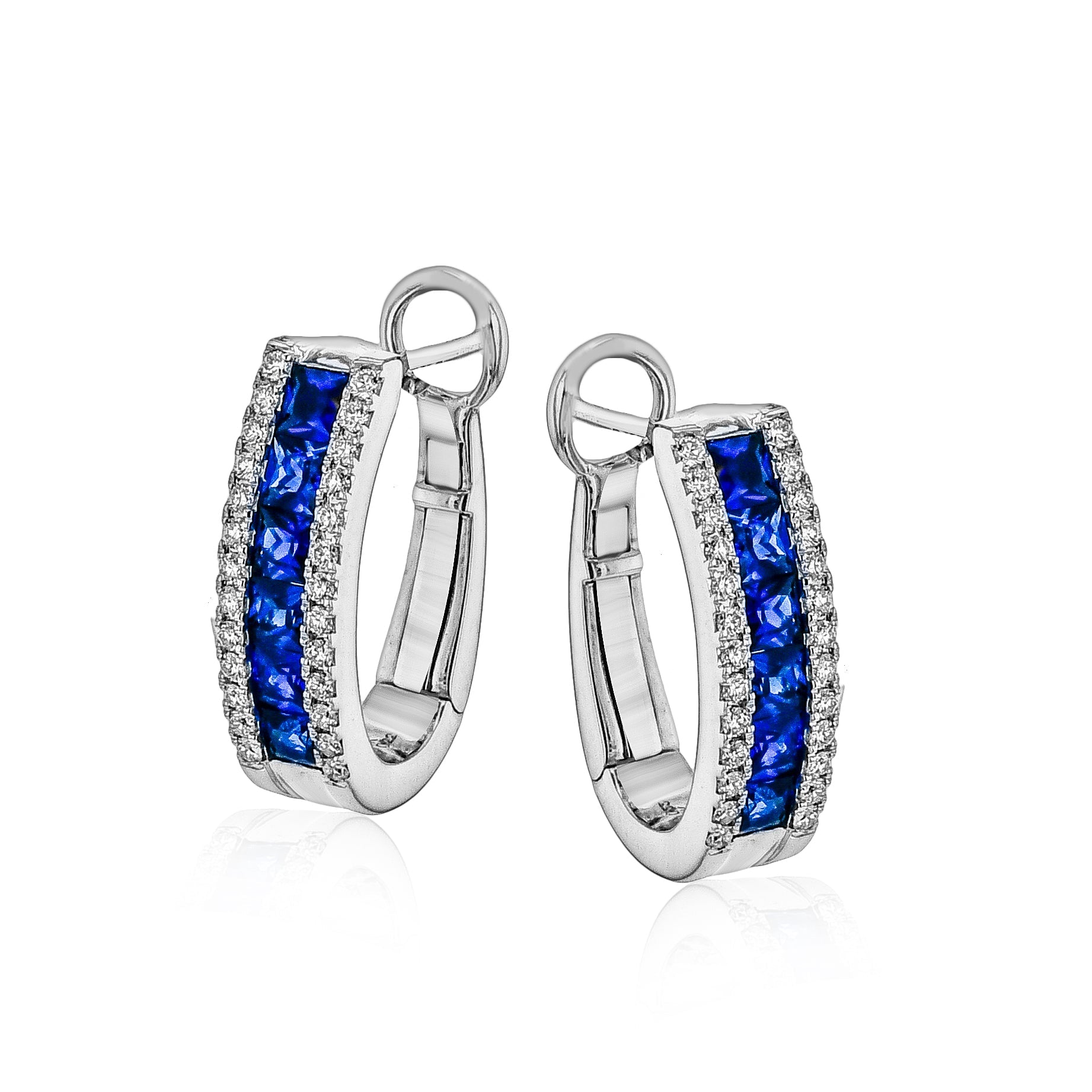 Crafted in 18K white gold, these Simon G earrings have sapphires and diamonds. Total diamond weight approx. 0.21 ct.