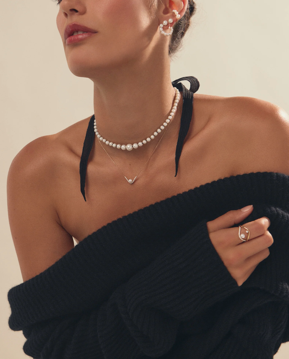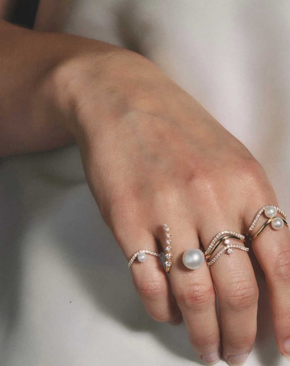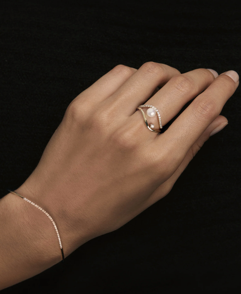 Mizuki Diamond and Pearl Curve Ring