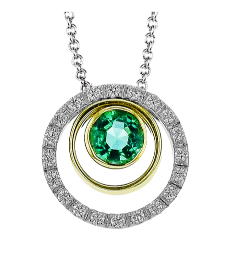 Crafted in 18K white gold, this Simon G necklace features emerald, diamond. Total diamond weight approx. 0.14 ct.
