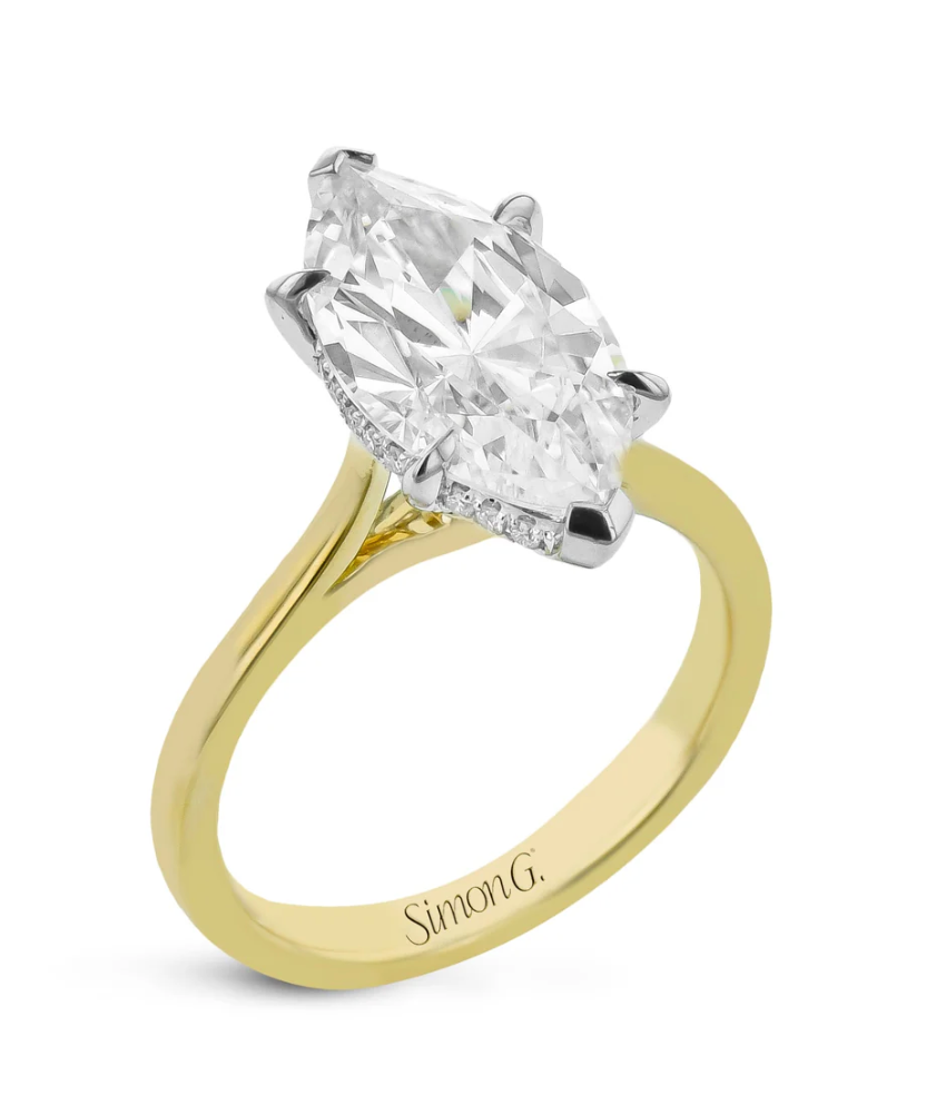 Crafted in 18K two-tone gold, this Simon G ring features diamond. Total diamond weight approx. 0.10 ct. This is a sample piece.